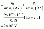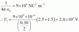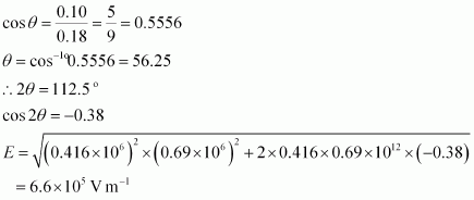 Therefore, the potential at a point 10 cm (perpendicular to the mid-point) is 2.0 × 105 V and electric field is 6.6 ×105 V m-1.