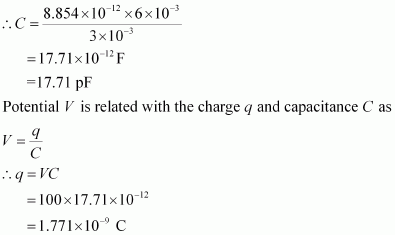 Therefore, capacitance of the capacitor is 17.71 pF and charge on each plate is 1.771 × 10-9 C.