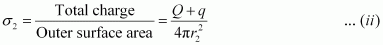 A charge of +q is induced on the outer surface of the shell. A charge of magnitude Q is placed on the outer surface of the shell. Therefore, total charge on the outer surface of the shell is Q + q. Surface charge density at the outer surface of the shell,