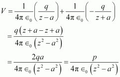 - #21-bObtain the dependence of potential on the distance r of a point from the origin when r/a >> 1.Ans : Distance r is much greater than half of the distance between the two charges. Hence, the potential (V) at a distance r is inversely proportional to square of the distance i.e.,
