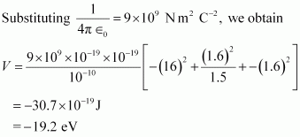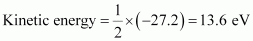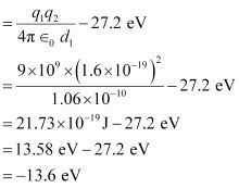 14``\pi``ε0=9×109Nm2C-2∴Potentialenergy=0-9×109×1.6×10-1920.53×10-10=-43.47×10-19J∵1.6×10-19J=1eV∴Potentialenergy=-43.7×10-19=-43.7×10-191.6×10-19=-27.2eV