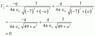 V1=-q4``\pi``∈01(5-0)2+(-a)2+q4``\pi``∈01(5-0)2+(a)2=-q4``\pi``∈025+a2+q4``\pi``∈025+a2=0Electrostatic potential, V2, at point (- 7, 0, 0) is given by,
