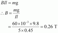- #21-aWhat magnetic field should be set up normal to the conductor in order that the tension in the wires is zero?Ans : Magnetic field (B) is equal and opposite to the weight of the wire i.e.,