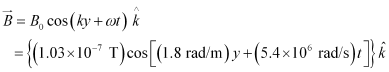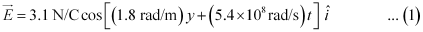 - Qstn #11Suppose that the electric field part of an electromagnetic wave in vacuum is E = {(3.1 N/C) cos [(1.8 rad/m) y + (5.4 × 106 rad/s)t]}