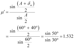 - Qstn #6A prism is made of glass of unknown refractive index. A parallel beam of light is incident on a face of the prism. The angle of minimum deviation is measured to be 40°. What is the refractive index of the material of the prism? The refracting angle of the prism is 60°. If the prism is placed in water (refractive index 1.33), predict the new angle of minimum deviation of a parallel beam of light.