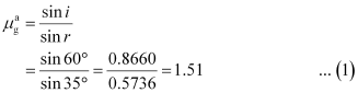 The relative refractive index of glass with respect to air is given by Snell’s law as: