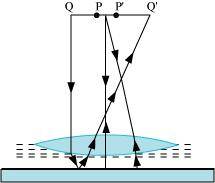 The liquid acts as a mirror. Focal length of the liquid = f2