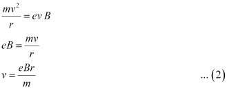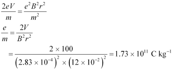 - Qstn #22An electron gun with its collector at a potential of 100 V fires out electrons in a spherical bulb containing hydrogen gas at low pressure (∼10-2 mm of Hg). A magnetic field of 2.83 × 10-4 T curves the path of the electrons in a circular orbit of radius 12.0 cm. (The path can be viewed because the gas ions in the path focus the beam by attracting electrons, and emitting light by electron capture; this method is known as the ‘fine beam tube’ method. Determine e/m from the data.