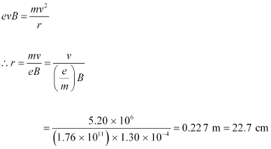 - #21-aA monoenergetic electron beam with electron speed of 5.20 × 106 m s-1 is subject to a magnetic field of 1.30 × 10-4 T normal to the beam velocity. What is the radius of the circle traced by the beam, given e/m for electron equals 1.76 × 1011 C kg-1.Ans : Speed of an electron, v = 5.20 × 106 m/s