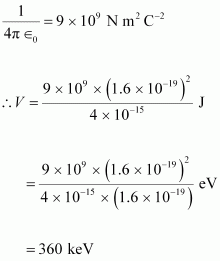 Ans : When two deuterons collide head-on, the distance between their centres, d is given as: