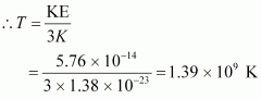 - #28-bConsider the radius of both deuterium and tritium to be approximately 2.0 fm. What is the kinetic energy needed to overcome the coulomb repulsion between the two nuclei? To what temperature must the gas be heated to initiate the reaction? (Hint: Kinetic energy required for one fusion event =average thermal kinetic energy available with the interacting particles = 2(3kT/2); k = Boltzman’s constant, T = absolute temperature.)Ans : Radius of deuterium and tritium, r ≈ 2.0 fm = 2 × 10-15 m