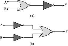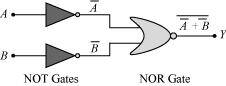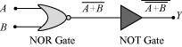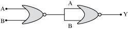 (Hint: A = 0, B = 1 then A and B inputs of second N OR gate will be 0 and hence Y=1. Similarly work out the values of Y for other combinations of A and B. Compare with the truth table of OR , AND, NOT gates and find the correct one.)