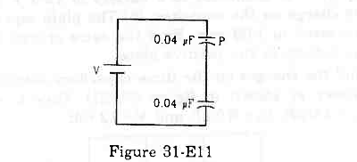 - Qstn #21The particle P shown in figure (31-E11) has a mass of 10 mg and a charge of -0⋅01 µC. Each plate has a surface area 100 cm2 on one side. What potential difference V should be applied to the combination to hold the particle P in equilibrium?