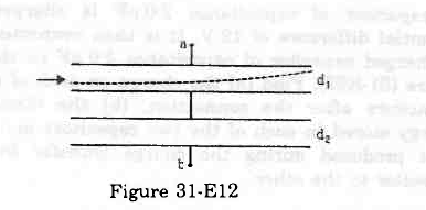 - Qstn #22Both the capacitors shown in figure (31-E12) are made of square plates of edge a. The separations between the plates of the capacitors are d1 and d2 as shown in the figure. A potential difference V is applied between the points a and b. An electron is projected between the plates of the upper capacitor along the central line. With what minimum speed should the electron be projected so that it does not collide with any plate? Consider only the electric forces.