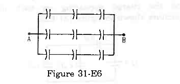 - Qstn #13Each of the capacitors shown in figure (31-E6) has a capacitance of 2 µF. find the equivalent capacitance of the assembly between the points A and B. Suppose, a battery of emf 60 volts is connected between A and B. Find the potential difference appearing on the individual capacitors.