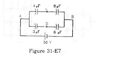 `` {C}_{1}=\frac{4\times 8}{4+8}=\frac{8}{3}\,\mathrm{\,\mu F\,}`` and `` {C}_{2}=\frac{3\times 6}{3+6}=\frac{18}{9}\,\mathrm{\,\mu F\,}=2\,\mathrm{\,\mu F\,}``