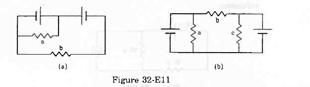 - #35Each of the resistors shown in the figure (32-E11) has a resistance of 10 Ω and each of the batteries has an emf of 10 V. Find the currents flowing through the resistors a and b in the two circuits.