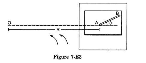 - Qstn #28A table with smooth horizontal surface is fixed in a cabin that rotates with a uniform angular velocity ω in a circular path of radius R. A smooth groove AB of length L(<<R) is made the surface of the table. The groove makes an angle θ with the radius OA of the circle in which the cabin rotates. A small particle is kept at the point A in the groove and is released to move at the point A in the groove and is released to move along AB. Find the time taken by the particle to reach the point B.
