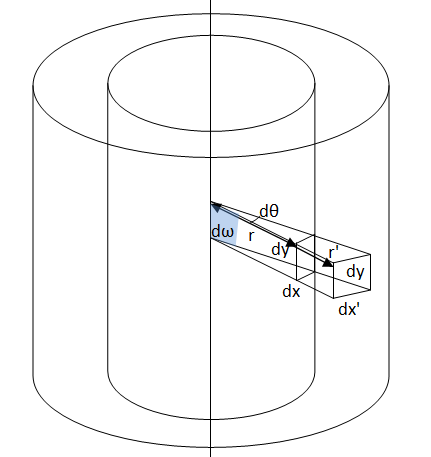 Let us consider two coaxial cylindrical surfaces at distances r and r' from the axis. Let areas dA and dA' subtend the solid angle dω at the central axis. The height of the area element will be same, i.e. equal to dy. Let the breath of dA be dx and that of dA' be dx'.