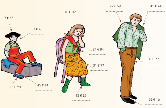 ........................ : 7 € 45 ........................ : 45 € 44 ........................ : 22 € 65 ........................ : 45 € 44 ........................ : 31 € 77 ........................ : 24 € 84 ........................ : 62 € 16 ........................ : 7 € 45 ........................ : 18 € 09 ........................ : 15 € 20 ........................ : 31 € 77 ........................ : 45 € 29 Ans : (Use the vocabulary of the clothes and use an article to show the gender of the noun.)