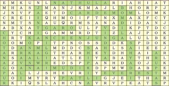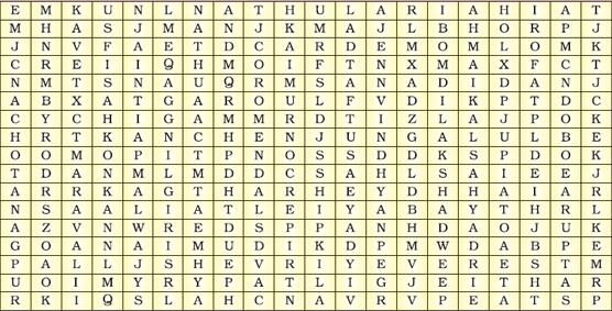 Locate the peaks, passes, ranges, plateaus, hills, and duns hidden in the puzzle. Try to find where these features are located. You may start your search horizontally, vertically or diagonally.