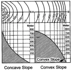 Concave Slope: The slope is very gentle at the foot and it goes on getting steeper and steeper towards the top. The spacing between successive contours at the lower level is more than at the higher level.