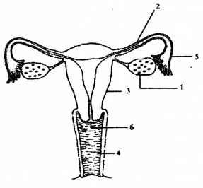- #7-b-ivMention the number and the name of the part involved in fertilization and implantation from the above diagram.Ans : 2 (Fallopian tube) for fertilization