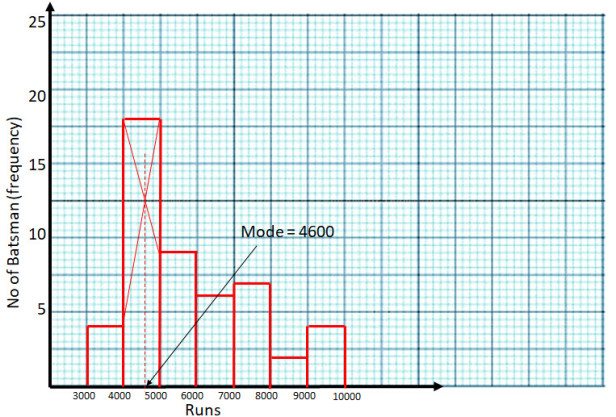 number of runs scored by 50 batsmen. Estimate the mode of the data:Runs scored 3000-4000 4000-5000 5000-6000 6000-7000 7000-8000 8000-9000 9000-10000 No. of batsmen 4 18 9 6 7 2 4 Ans :