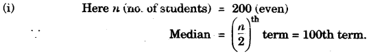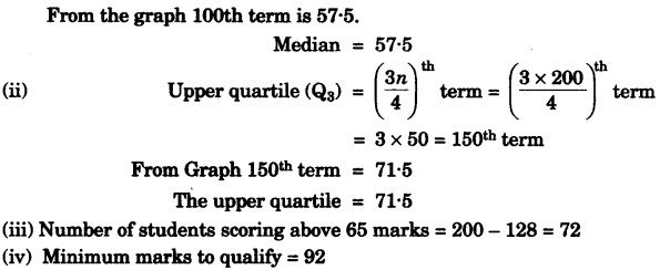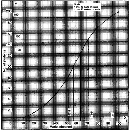 Draw an Ogive for the given distribution taking 2 cm = 10 marks on one axis and 2 cm = 20 students on the other axis. From the graph find:Marks 0-10 10-20 20-30 30-40 40-50 50-60 60-70 70-80 80-90 90-100 No. of Students 5 10 14 21 25 34 36 27 16 12 Ans :Marks No. of students cf 0-10 5 5 10-20 10 15 20-30 14 29 30-40 21 50 40-50 25 75 50-60 34 109 60-70 36 145 70-80 27 172 80-90 16 188 90-100 12 200