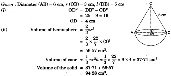 - #8-cThe given figure represents a hemisphere surmounted by a conical block of wood. The diameter of their bases is 6 cm each and the slant height of the cone is 5 cm. Calculate:Ans :