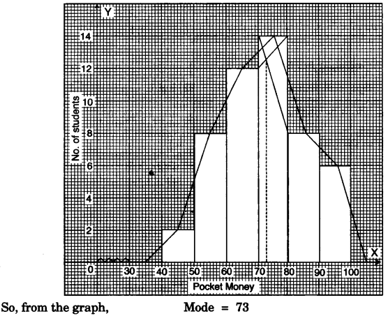 Draw a histogram and a frequency polygon on the same graph. Find the mode from the graph.Weekly pocket money in Rs. 40-50 50-60 60-70 70-80 80-90 90-100 No. of students 2 8 12 14 8 6 Ans :