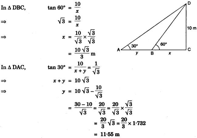 - #9-b [4]From two points A and B on the same side of a building, the angles of elevation of the top of the building are 30° and 60° respectively. If the height of the building is 10m, find the distance between A and B correct to two decimal places.Ans :