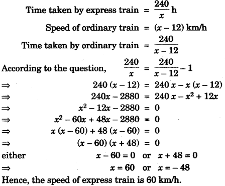 - #11-b [4]The speed of an express train is x km/h and the speed of an ordinary train is 12 km/h less than that of the express train. If the ordinary train takes one hour longer than the express train to cover a distance of 240 km, find the speed of the express train.Ans :