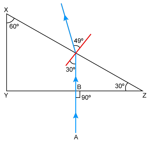 Ans :The following diagram shows a 60°, 30°, 90° glass prism of critical angle 42°.